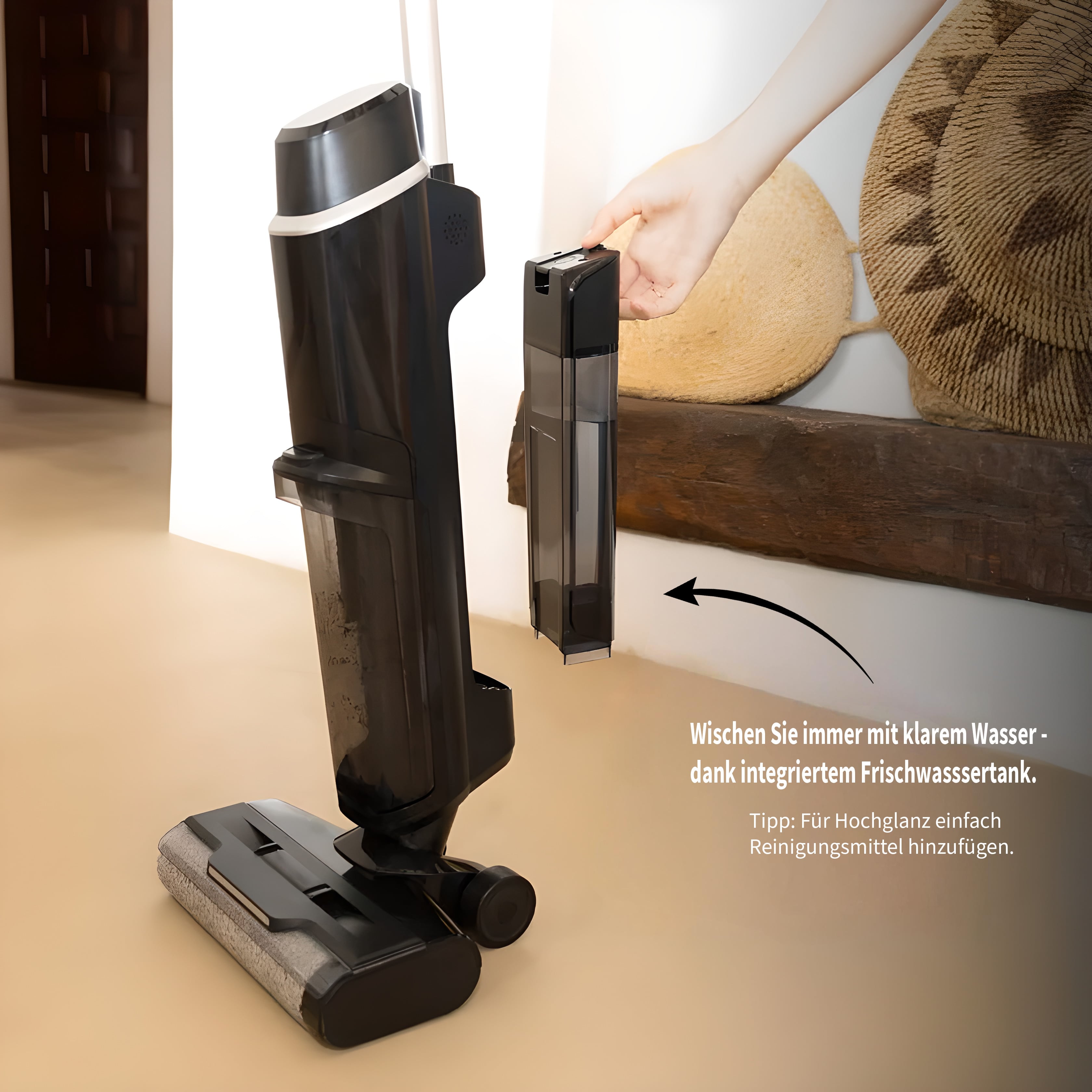 - Frischwassersystem: Wischen ausschließlich mit sauberem Wasser – für hygienische Reinigung ohne Rückstände